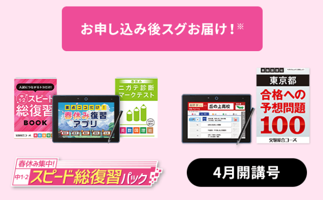この復習パックは、お申し込みいただいてから4日前後でお届けします。本キャンペーンをきっかけに、受験生生活のスタートダッシュを切ってみるのはいかがでしょうか。